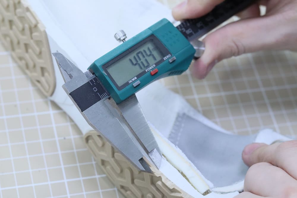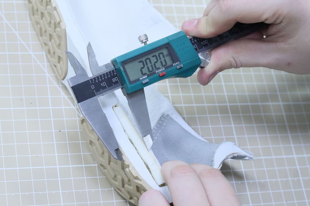 Контрольные измерения производились в ключевых точках стопы — в области носка, свода и пятки, где оценивалась толщина основных слоев подошвы. Ее форма анатомически точна и повторяет естественные изгибы стопы. Это создает эффект комфортной посадки, обеспечивает оптимальную поддержку, помогает сохранять правильное положение стопы и минимизирует напряжение в суставах.